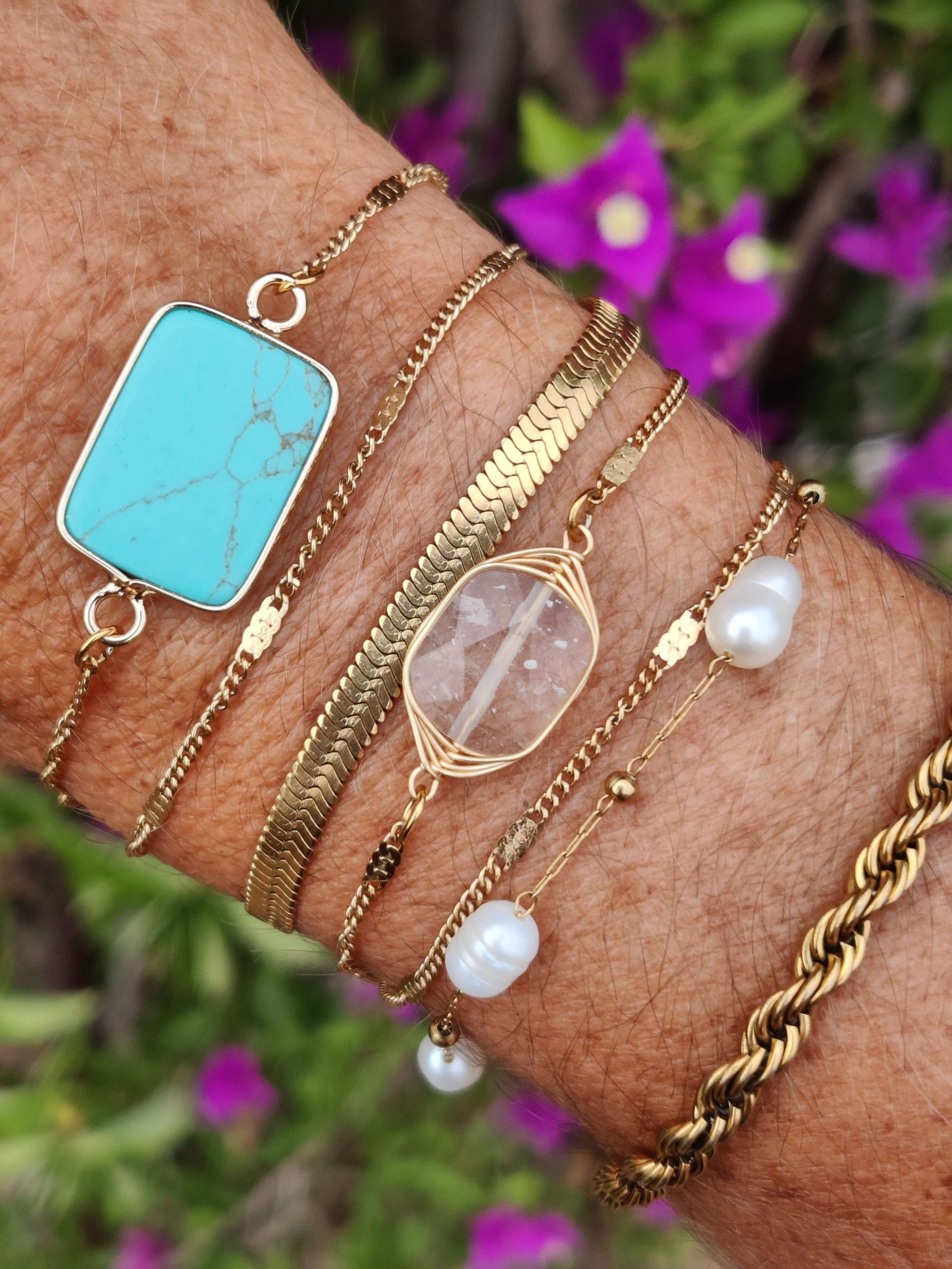 Collar choker y pulsera doble giro con piedra semi preciosa turquesa con cadena en acero inoxidable con baño de oro 18 quilatesº