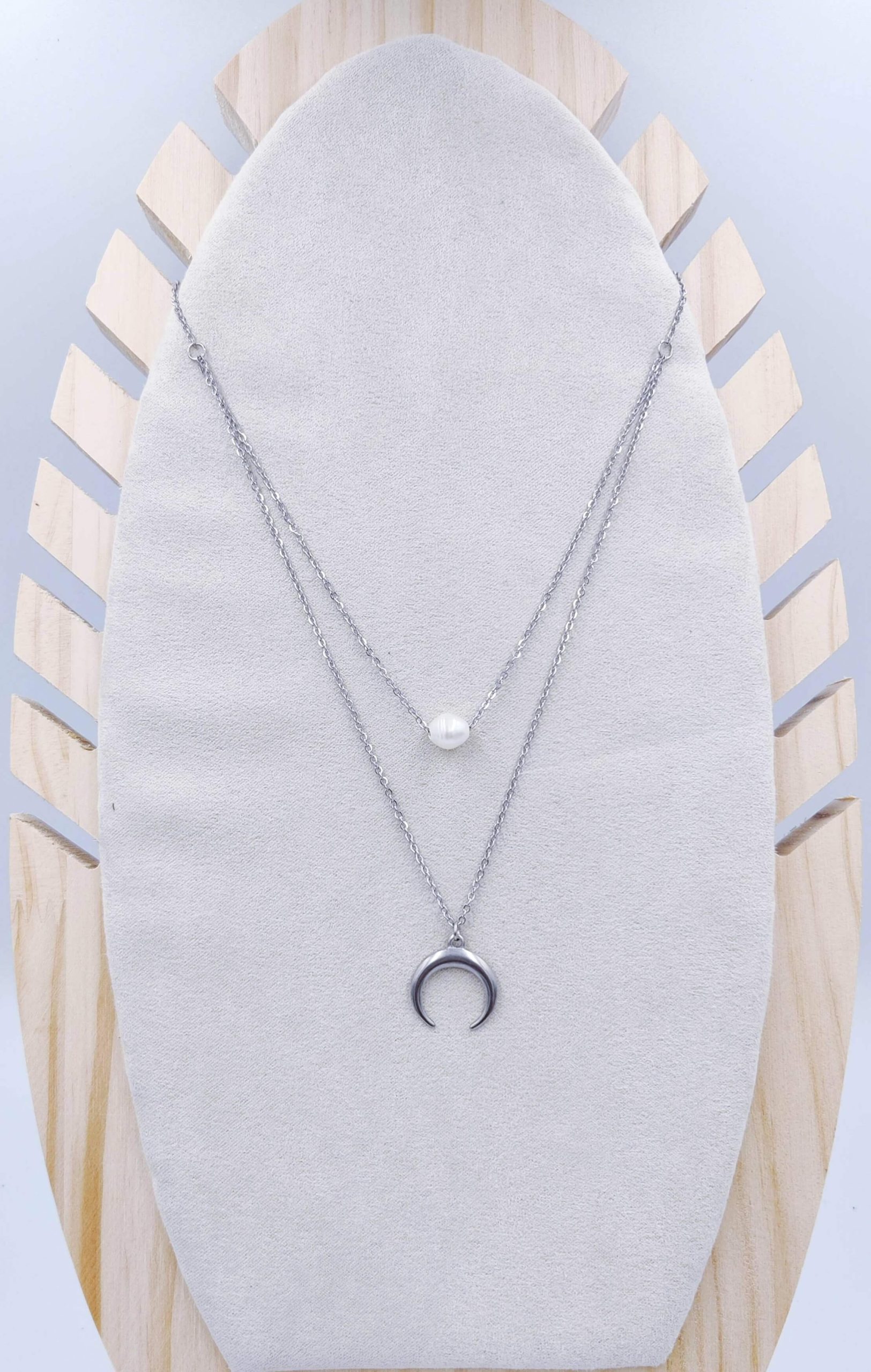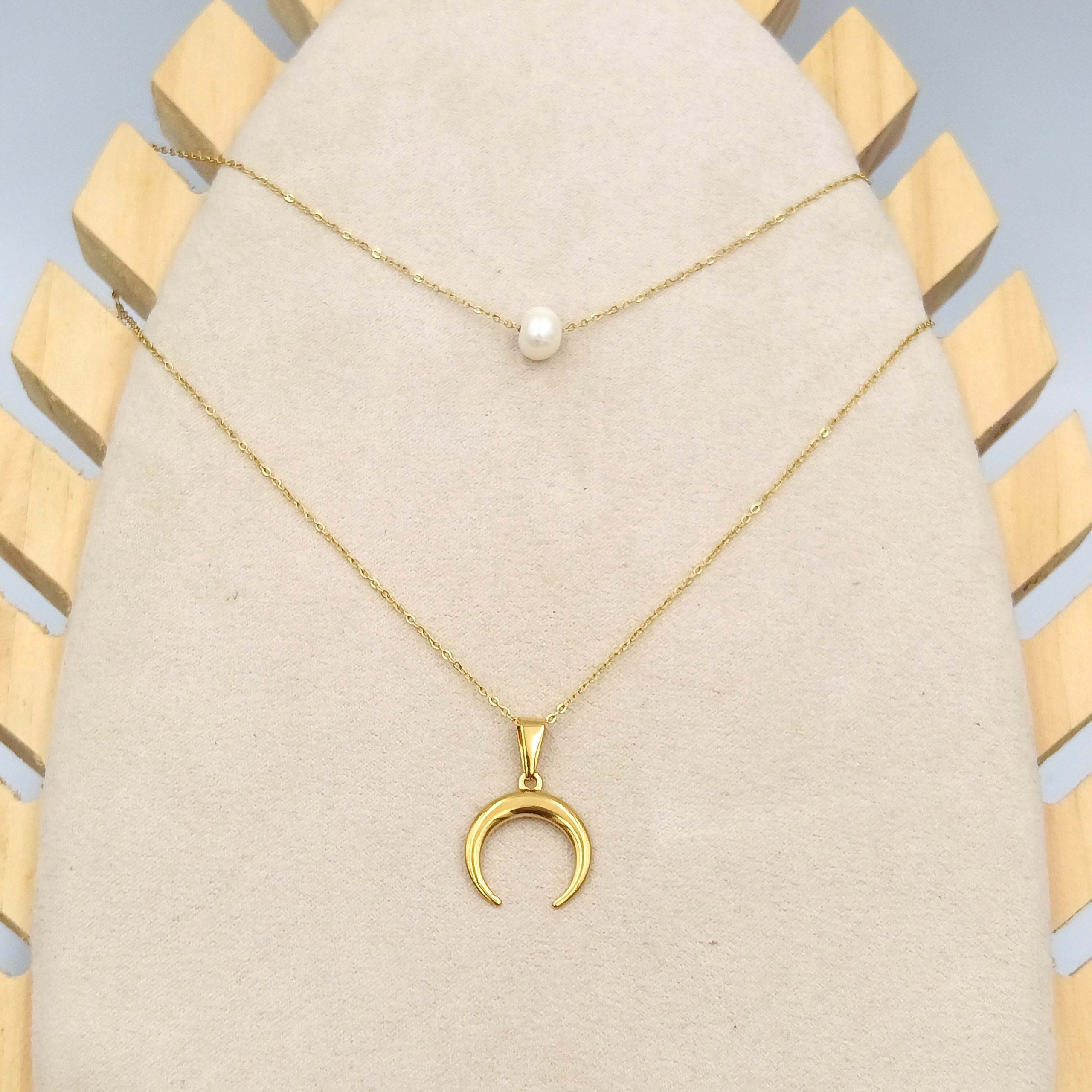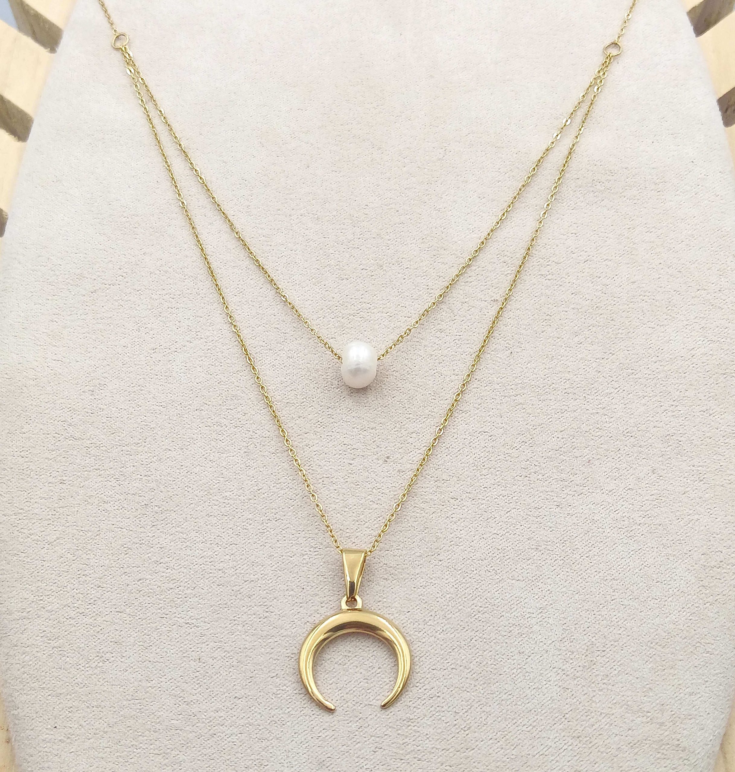Collar Doble con dije Luna invertida y perla de río (agua dulce), en acero inoxidable con o sin baño de oro 18 quilates
