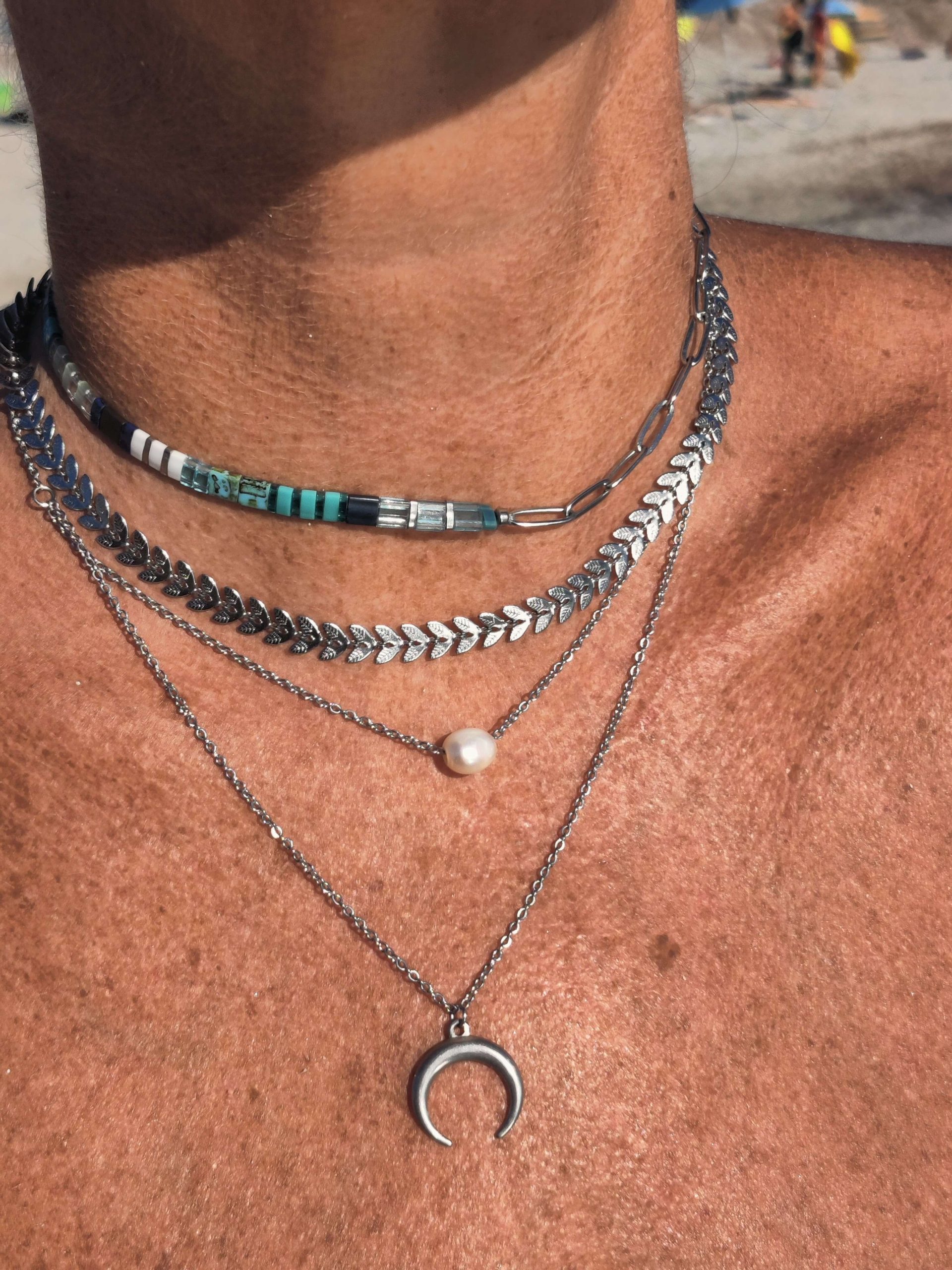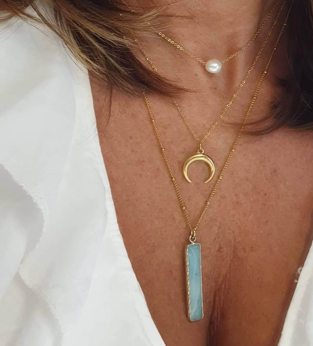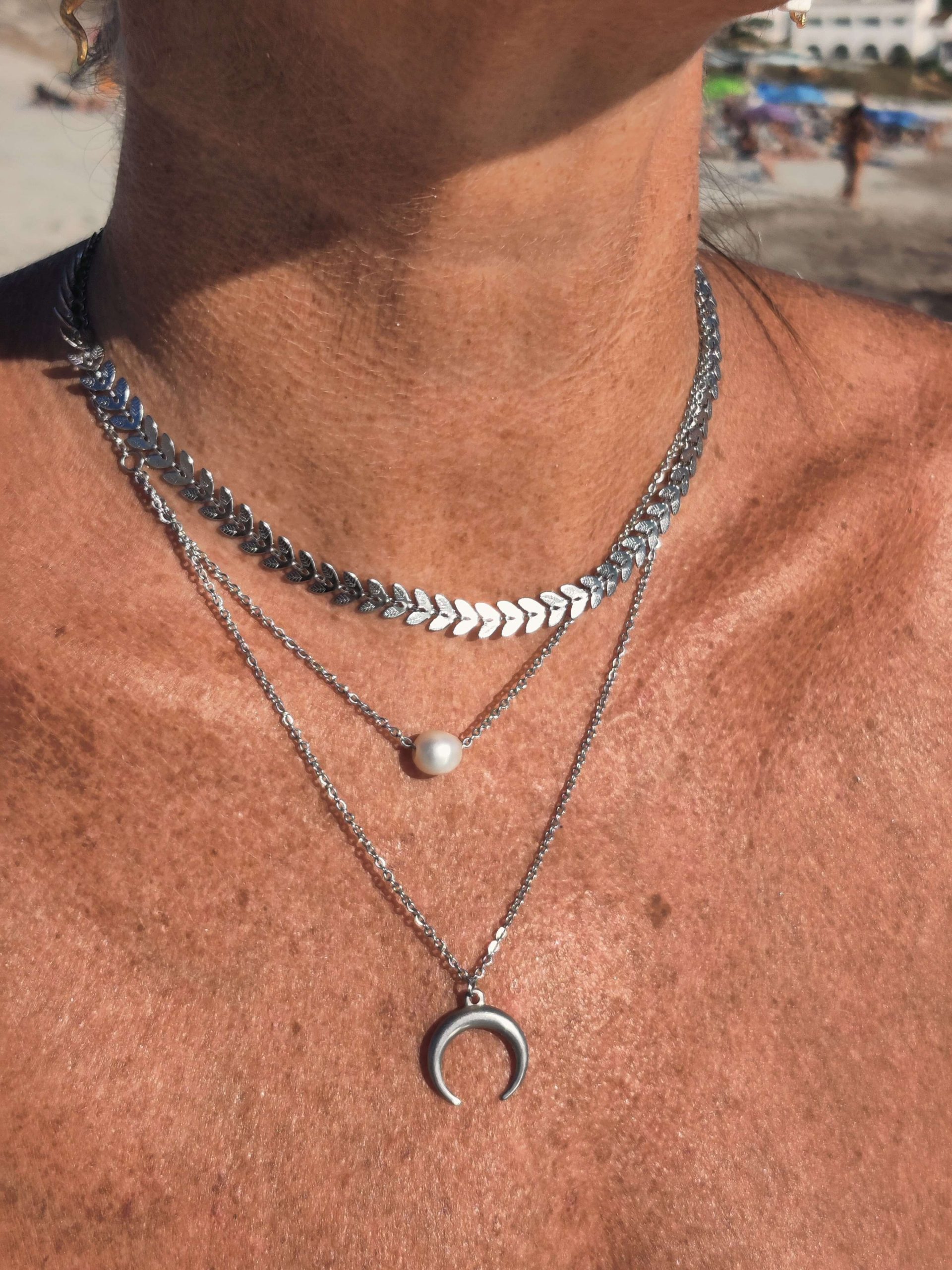 Collar Doble con dije Luna invertida y perla de río (agua dulce), en acero inoxidable con o sin baño de oro 18 quilates