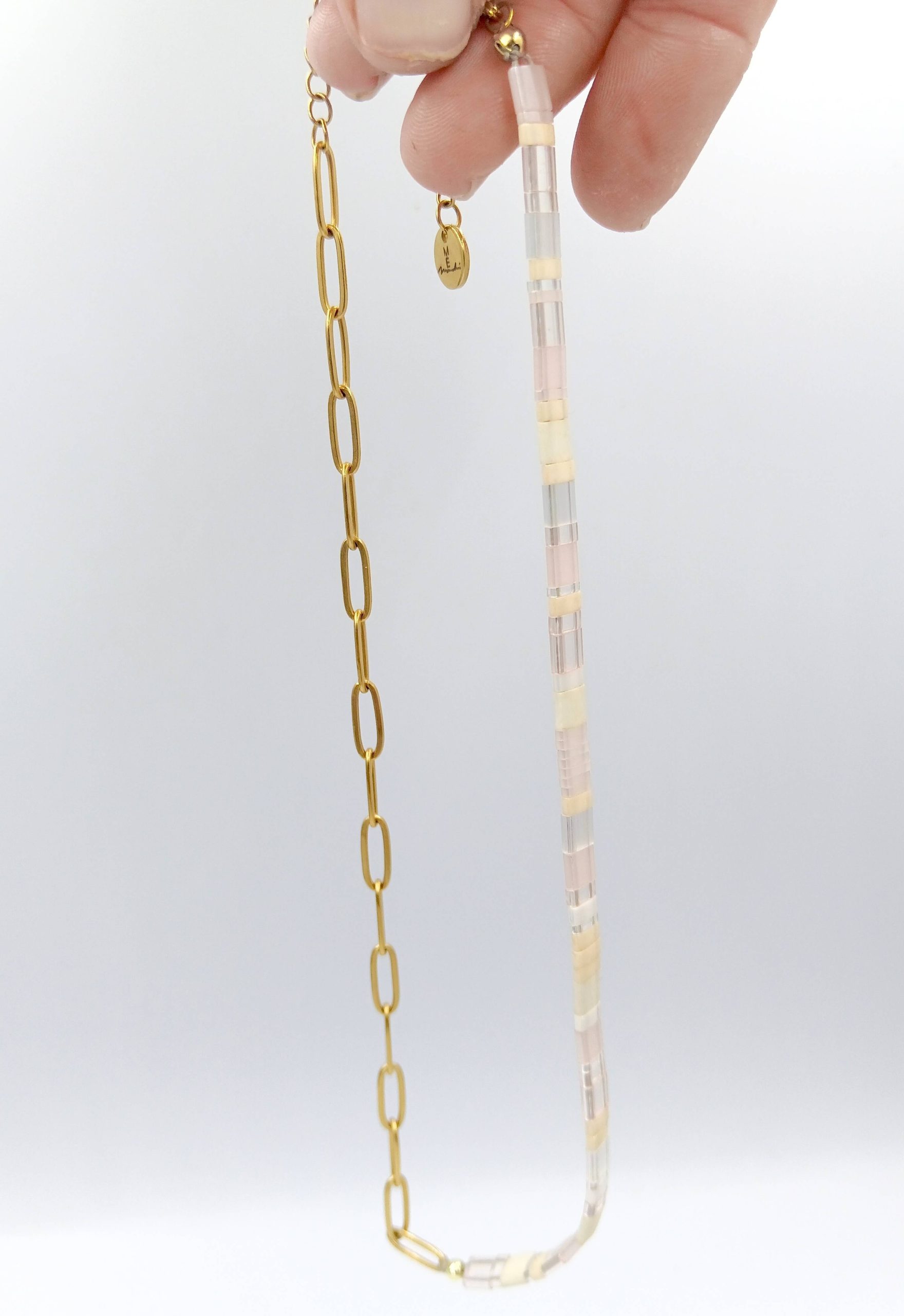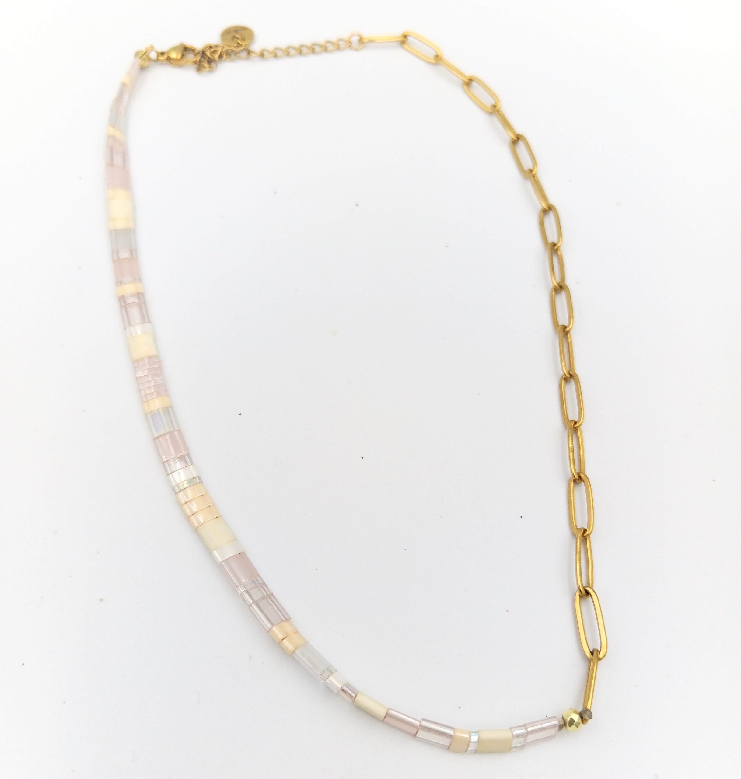 Collar cristal japonés con mitad de cadena eslabones en acero inoxidable con baño de oro 18 quilates