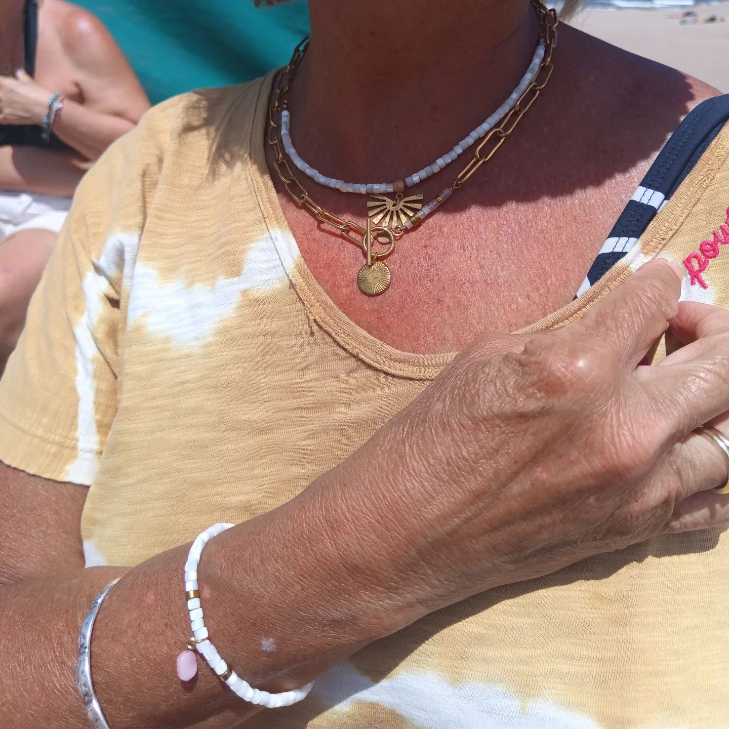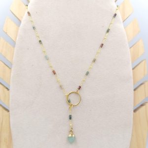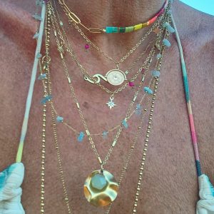 Colar nácar blanco con cadena de eslabones en acero inoxidable con baño de oro 18 quilates. Con dije de acero inoxidable con baño de oro 18 quilates