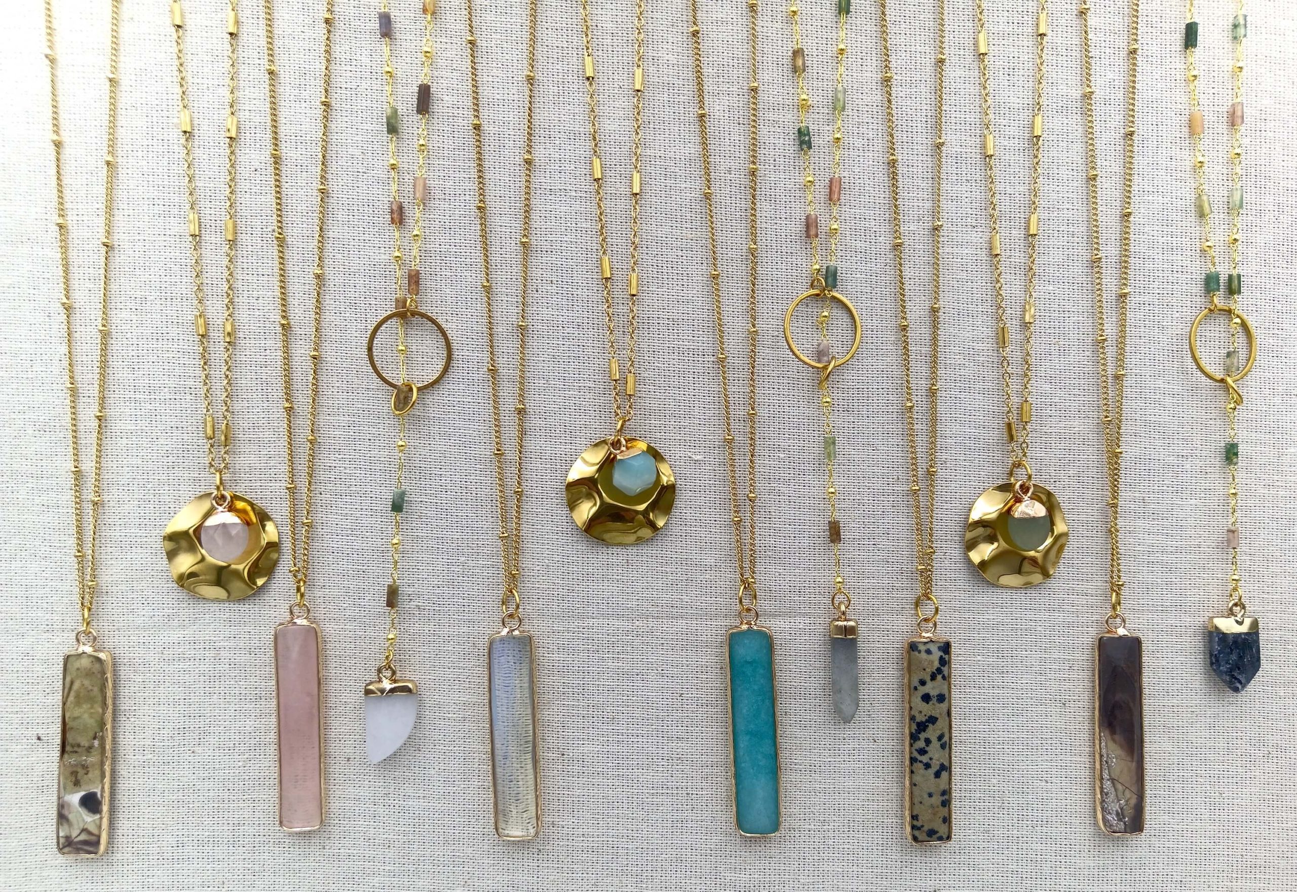 Collar Piedra Alargada con piedra semi preciosa con cadena de diseño bolitas, tipo rosario en acero inoxidable con baño de oro 18 quilates.