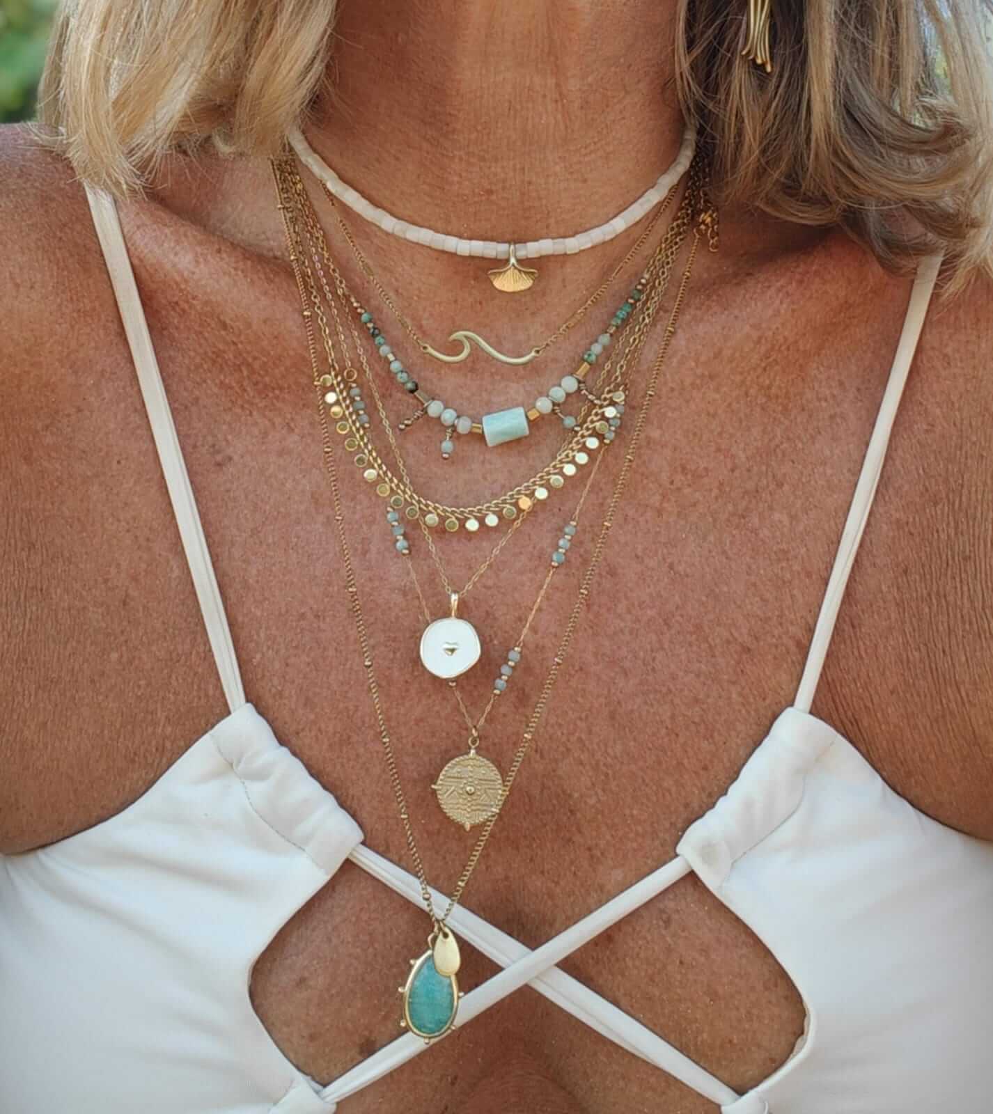 Collar Piedra Gota con piedra semi preciosa con cadena de diseño bolitas, tipo rosario en acero inoxidable con baño de oro 18 quilates