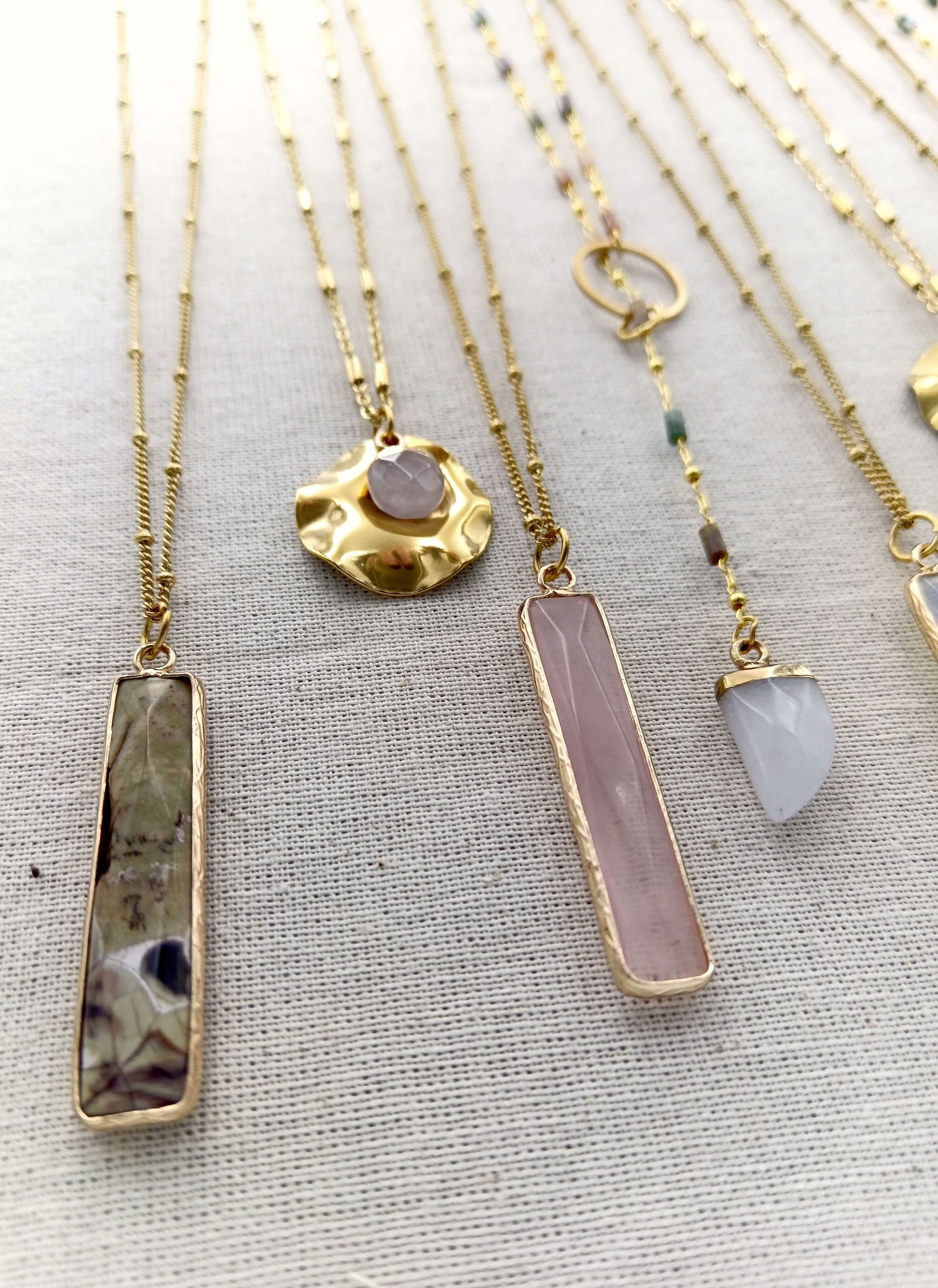 Collar Piedra Alargada con piedra semi preciosa con cadena de diseño bolitas, tipo rosario en acero inoxidable con baño de oro 18 quilates
