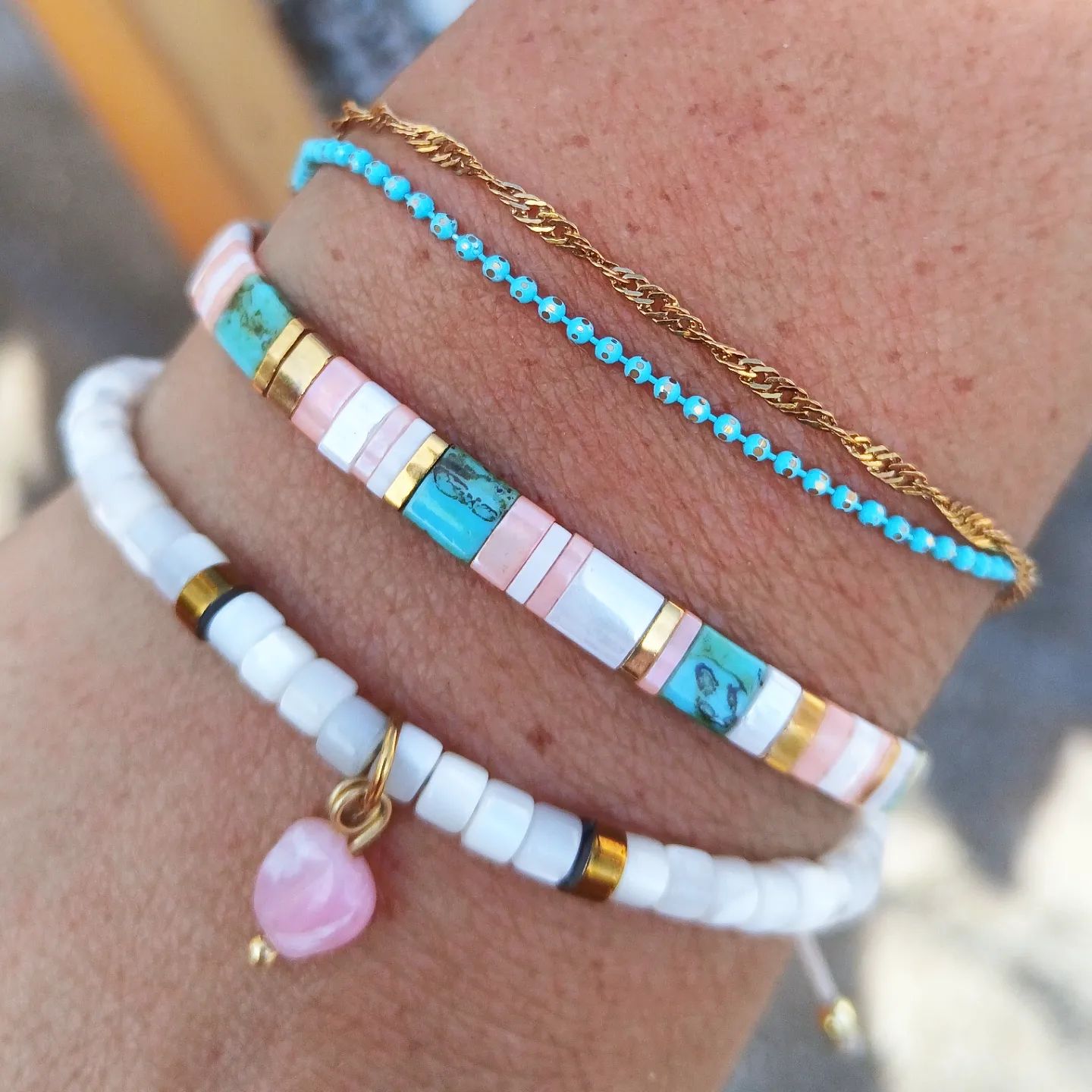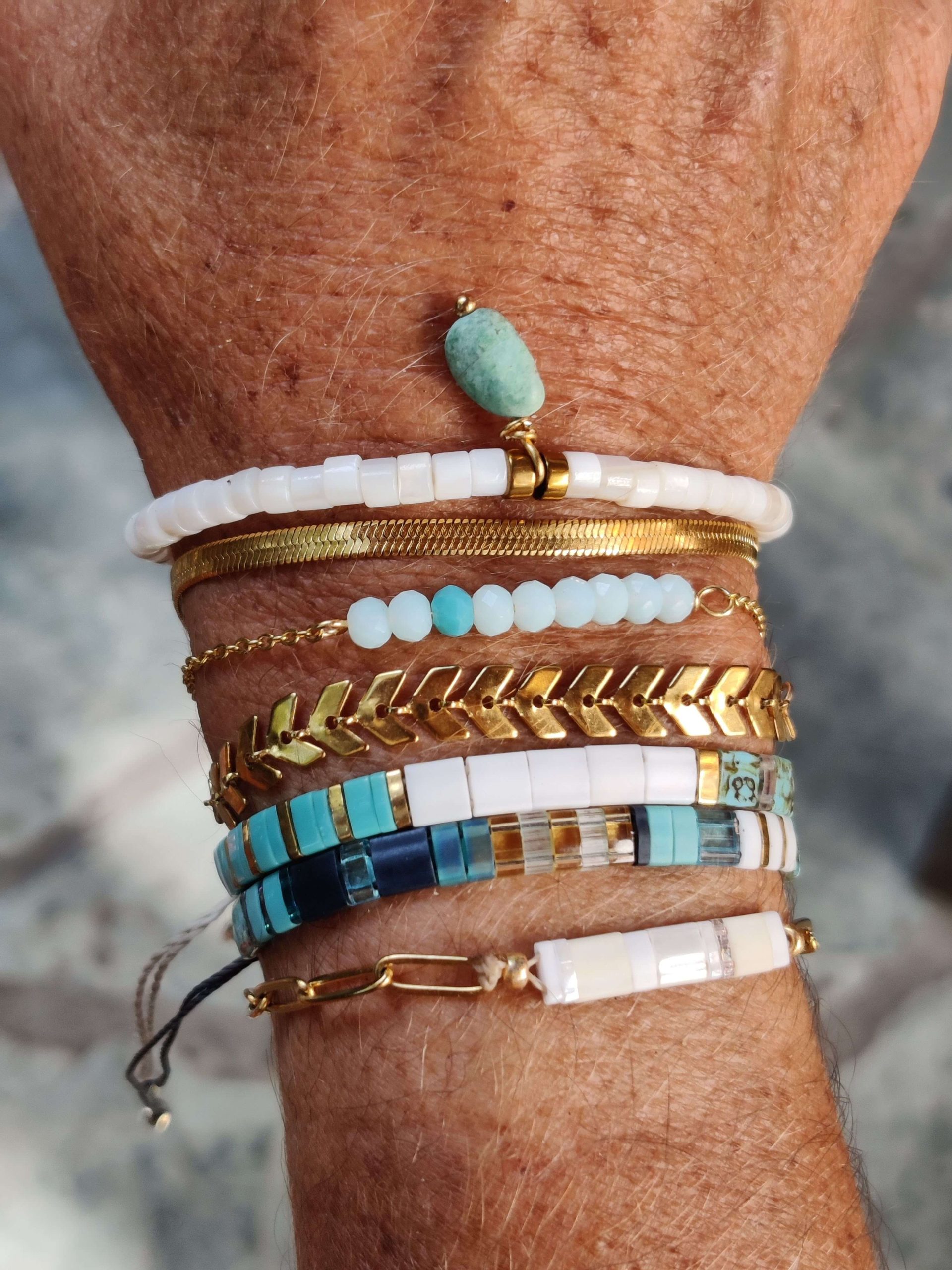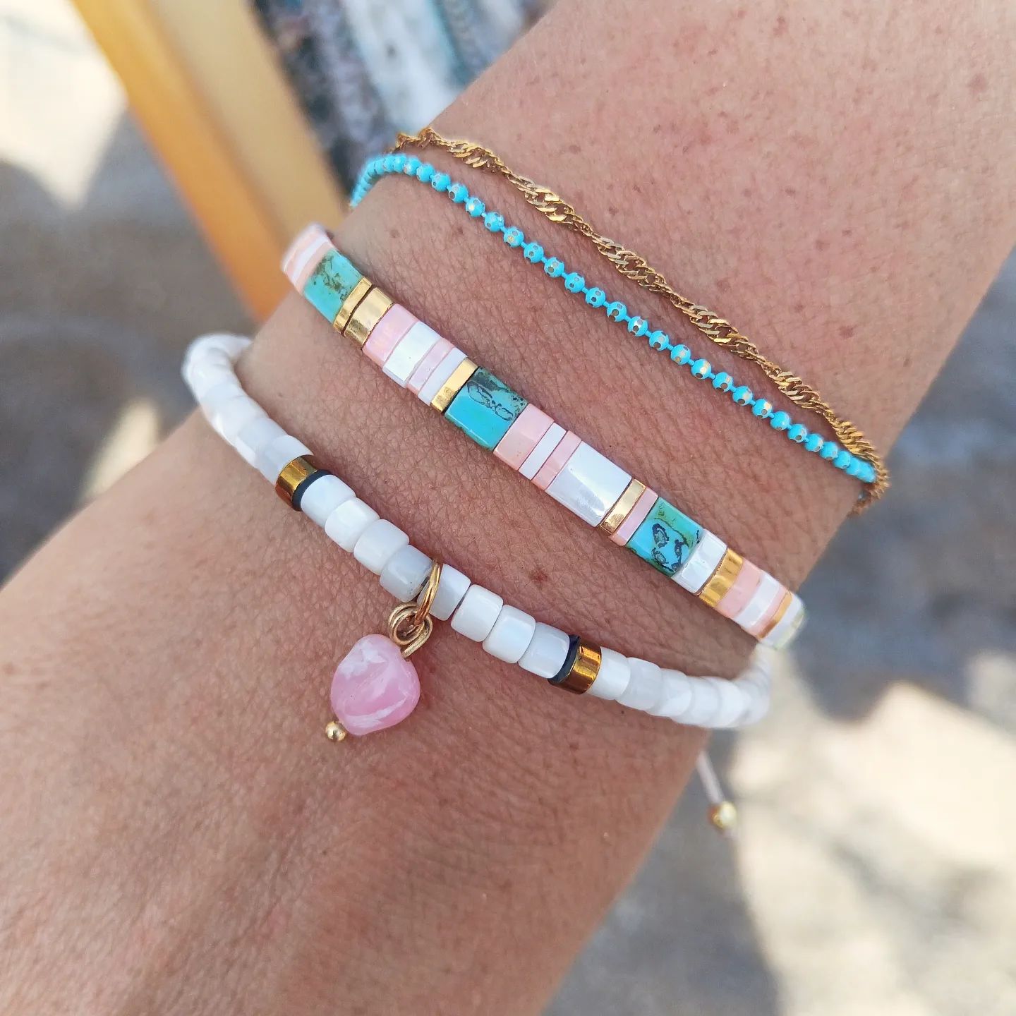 Pulsera Nácar blanco con hematites doradas y piedra semi preciosa ópalo rosa o crisocola verde y cadena de acero inoxidable con baño de oro 18 quilates