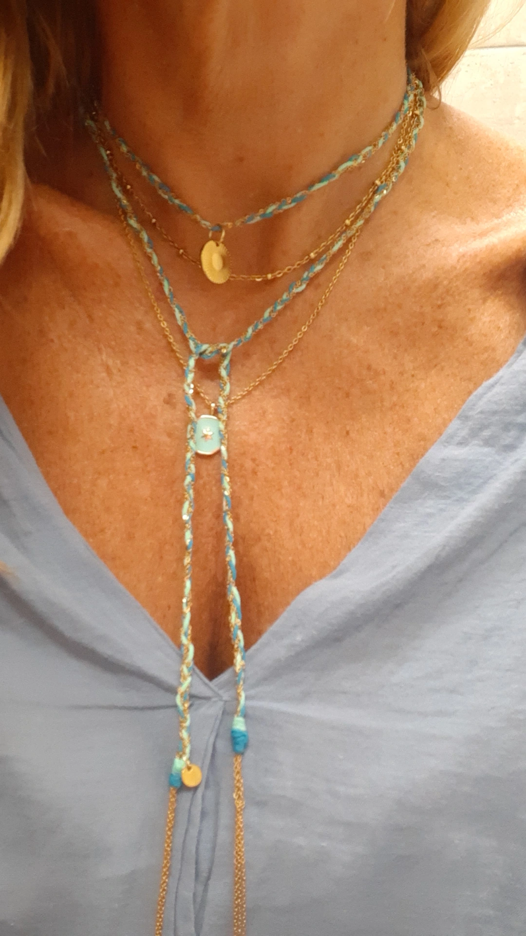Trenza en hilo encerado y cadena de acero inoxidable con baño de oro 18 quilates. Con dije en acero y terminaciones con piedras.